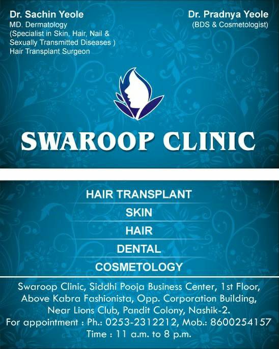 Swaroop Clinic is new destination for customized skin care based on real science. To help you get your clearest, smoothest and most youthful skin possible. Created by popular dermatologist Dr.Sachin Yeole(M.D) and Dr.Pradnya Yeole. Swaroop Clinic offers unparalleled service with real results. We use state-of-the-art technologies and the finest medical grade ingredients, and every treatment program is customized to your specific needs to help you reach your goals quickly. Swaroop Clinic offers a selection of beauty enhancement services. Dermatologists at Swaroop Clinic provide high quality care, ensuring that patients receive the most advanced treatments available.From chemical peels to laser hair removal, we provide the latest in skin care technology to help reverse the signs of aging and reveal our patients’ natural beauty.